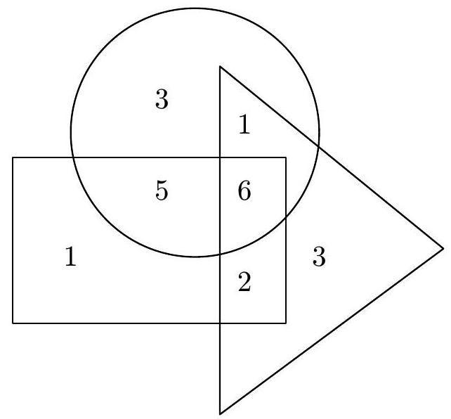 🔑:From the second and fifth conditions, it follows that there is at least 1 star in cell A and at least 2 stars in cell B. Therefore, there are at least 3 stars in cells A and B combined. From the third and fourth conditions, it follows that there are no more than 3 stars in these two cells combined. Therefore, there are exactly 3 stars in cells A and B combined, and there are 5 stars in cell C:A=1, quad B=2, quad C=5We will also label the other cells with letters as shown in the following image:Each of the cells A, B, and C is shared by two of the three shapes mentioned in the sixth condition (for example, cell A belongs to the circle and the triangle). Cell D is shared by all three shapes. The remaining cells E, F, and G belong to different shapes. The sum of the stars in the circle, triangle, and rectangle is 15+12+14=41, and in this sum, the stars in cells A, B, C are counted twice, the stars in cell D are counted three times, and the stars in cells E, F, G are counted once. According to the first condition, there are a total of 21 stars, and in this sum, the stars in each cell are counted once. The difference of 20 stars therefore corresponds to the sum of the stars in cells A, B, C (which is a total of 8) and twice the number of stars in cell D. Therefore, there must be 6 stars in cell D:D=(20-8): 2=6 .The number of stars in the remaining cells can now be calculated according to the information in the sixth condition:begin{aligned}& 15=A+C+D+E, quad text { so } quad E=15-1-5-6=3, & 12=A+B+D+F, quad text { so } quad F=12-1-5-2=3, & 14=B+C+D+G, quad text { so } quad G=14-2-5-6=1 .end{aligned}Another solution. As in the previous solution, we derive the number of stars in cells A, B, and C:A=1, quad B=2, quad C=5 .According to the information in the sixth condition, we find thatbegin{aligned}& 15=A+C+D+E, quad text { so } quad D+E=15-1-5=9, & 12=A+B+D+F, quad text { so } quad D+F=12-1-2=9, & 14=B+C+D+G, quad text { so } quad D+G=14-2-5=7 .end{aligned}From this, we see that the number of stars in cells E and F is the same, and it is 2 more than the number of stars in cell G. Now we can substitute the number of stars in any of the cells D, E, F, G, express the number of stars in the remaining three cells from the previous expressions, and verify whether the total sum A+B+C+D+E+F+G is equal to 21. We substitute for G, keeping in mind that there must be at least one star in each cell:| G | E=F | D | sum || :---: | :---: | :---: | :---: || mathbf{1} | mathbf{3} | mathbf{6} | mathbf{2 1} || 2 | 4 | 5 | 23 || 3 | 5 | 4 | 25 || 4 | 6 | 3 | 27 || 5 | 7 | 2 | 29 || 6 | 8 | 1 | 31 |The only valid option is highlighted in the first row.