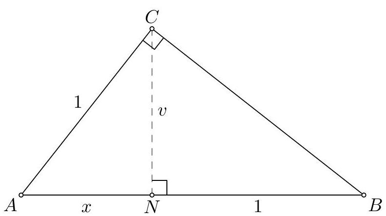🔑:## First solution.Let |A N|=x and |C N|=v.According to Euclid's theorem, we have |A N| cdot |N B|=|N C|^{2}, which means x cdot 1=v^{2}.1 pointAccording to the Pythagorean theorem, we have |C N|^{2}=|A C|^{2}-|A N|^{2}, which means v^{2}=1-x^{2}. 1 pointIt follows that x=1-x^{2}, or x^{2}+x-1=0.The solution to this equation is x=frac{-1+sqrt{5}}{2} (the other solution is negative),so the length of the hypotenuse |A B|=|A N|+|N B|=x+1=frac{1+sqrt{5}}{2}.1 point