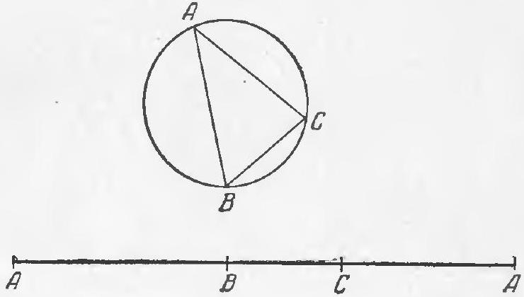🔑:95. Since all points on the circle are equal to each other, we can consider that the first of the three points (point A) is somehow fixed. The positions of points B and C will then be determined by the lengths of the arcs A B and A C, measured in a certain direction (for example, counterclockwise). Now, let's cut the circle at point A and unfold it into a segment A A^{prime} (Fig. 83; the fact that both ends of this segment represent the same point on the circle is not important for us). The presence of an obtuse angle in triangle A B C clearly means that one of the three arcs into which its vertices divide the segment exceeds a semicircle. Therefore, after transitioning from the circle to the segment A A^{prime}, our problem takes the following form: two points B and C are taken randomly on the segment A A^{prime}; what is the probability that none of the three parts into which these points divide the circle exceeds half the length of the segment? But calculating this last probability is the content of problem 93 (see the solution to the specified problem); therefore, the answer to this problem coincides with the answer to problem 93: the desired probability is frac{1}{4}.Fig. 83.