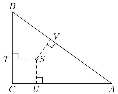 🔑:Solution. The distances between the vertices and points of tangency of the incircle (denoted according to the figure) of a triangle A B C are|A U|=|A V|=frac{b+c-a}{2}, quad|B V|=|B T|=frac{a+c-b}{2}, quad|C T|=|C U|=frac{a+b-c}{2},which is easy to obtain from|A V|+|B V|=c, quad|A U|+|C U|=b, quad|B T|+|C T|=a .Fig. 1The points C, T, U, and S (the center of the incircle) form a deltoid, actually a square, if the angle A C B is right. The side of the square is rho=|S U|=|C U|. This givesrho=frac{a+b-c}{2}moreover according to the Thales theorem r=frac{1}{2} c and we getr+rho=frac{c}{2}+frac{a+b-c}{2}=frac{a+b}{2} .Conclusion. There is only one possible value of the quotient (r+rho) /(a+b) in any right triangle, namely frac{1}{2}.
