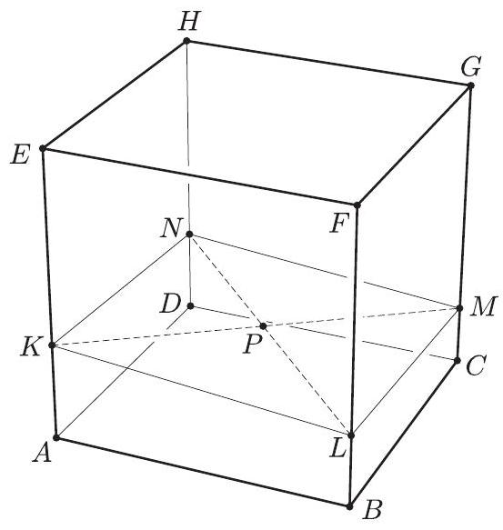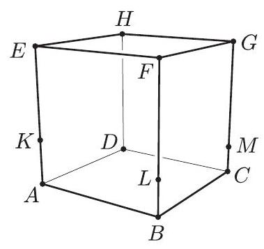 🔑:Solution. We can assume that the length of the edges of the cube is 1. Then A K=1 / 3, B L=1 / 4 and C M=1 / 5. Let N be the intersection point of the edge D H and the plane K L M, mathcal{S} the plane passing through M, and mathcal{T} the horizontal plane passing through K.Then mathcal{S} cuts a right prism mathcal{H}_{1} with base A B C D from the cube, whose height is C M, so its volume is V_{1}=1 / 5. The plane mathcal{T} cuts a right prism mathcal{H}_{2} with base E F G H from the cube, whose height is E K=A E-A K, so its volume is V_{2}=2 / 3. The part of the cube between the planes mathcal{S} and mathcal{T} is also a right prism, denoted by mathcal{H}_{3}. Its volume isV_{3}=1-left(V_{1}+V_{2}right)=1-left(frac{1}{5}+frac{2}{3}right)=frac{2}{15}We will show that the plane K L M N bisects the volume of mathcal{H}_{3}. The lines K L and M N are coplanar, but since they lie on two parallel faces of the cube, one on A B F E and the other on D C G H, they cannot intersect. Therefore, the two lines are parallel. Similarly, we can show that the lines L M and K N are also parallel. Thus, the quadrilateral K L M N is a parallelogram because its opposite sides are parallel. Then, however, its diagonals bisect each other. Let the intersection point of the diagonals of K L M N be P. Then P is also the midpoint of the body diagonal K M of the right prism mathcal{H}_{3}, which is the center of symmetry of the prism, because the midpoints of the four body diagonals of the prism coincide. The central reflection about P therefore maps mathcal{H}_{3} onto itself, swapping the point pairs (K, M) and (L, N). Thus, it swaps the parts of mathcal{H}_{3} below and above the plane K L M N. Therefore, the two parts are congruent, and thus each part has a volume of frac{V_{3}}{2}=frac{1}{15}.The volume of the part of the cube below the plane K L M N is thereforeV_{1}+frac{V_{3}}{2}=frac{1}{5}+frac{1}{15}=frac{4}{15}and the volume of the part above the plane K L M N isV_{2}+frac{V_{3}}{2}=frac{2}{3}+frac{1}{15}=frac{11}{15}Thus, the ratio of the volumes of the two parts is 4: 11.