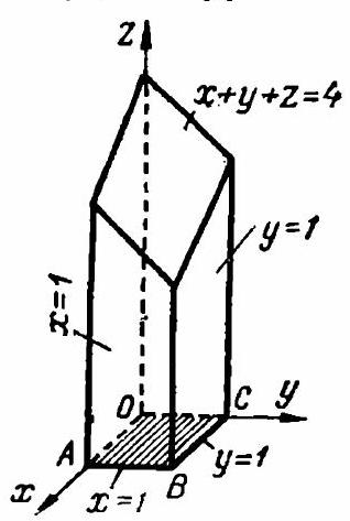 🔑:Solution. By constructing the given planes (Fig. 170), we observe that the truncated prism bounded by them is symmetric with respect to the plane x=y. Consequently,Fig. 170 this x_{c}=y_{c}.Next, we compute the integrals contained in formulas (5),I_{1}=iint_{D} x z d x d y=iint_{O B C} x(4-x-y) d x d y=begin{gathered}=-int_{0}^{1} x d x int_{1}^{1}(4-x-y) d(4-x-y)=-left.int_{n}^{1} frac{(4-x-y)^{2}}{2}right|_{y=0} ^{y=1} x d x= =frac{1}{2} int_{1}^{n}left(2 x^{2}-7 xright) d x=left.frac{1}{2}left(frac{2}{3} x^{3}-frac{7}{2} x^{2}right)right|_{i} ^{n}=frac{17}{12} I_{2}=int_{1} int_{1} z^{2} d x d y=iint_{n i C C}(4-x-y)^{2} d x d y=end{gathered}begin{aligned}= & -int_{n}^{1} d x int_{1}^{1}(4-x-y)^{2} d(4-x-y)=-left.int_{n}^{1} frac{(4-x-y)^{3}}{3}right|_{1=1} ^{1=1} d x= & =frac{1}{3} int_{i}^{1}left|(3-x)^{3}-(4-x)^{3}right| d x=left.frac{1}{3}left[frac{(x-3)^{1}}{4}-frac{(x-4)^{1}}{4}right]right|_{1} ^{1}=frac{55}{6} ; I_{3}= & int_{D} int_{0}^{1} z d x d y==int_{0}^{1} d x int_{1}^{1}(4-x-y) d y=-left.frac{1}{2} int_{0}^{1}(4-x-y)^{2}right|_{y==1} ^{u=1} d x= & =-frac{1}{2} int_{0}^{1}left|(3-x)^{2}-(4-x)^{2}right| d x=left.frac{1}{2}left[frac{(x-3)^{3}}{3}-frac{(x-4)^{3}}{3}right]right|_{1} ^{0}=3 .end{aligned}Substituting the found values of the integrals into formulas (5),we get:x_{c}=y_{c}=frac{l_{1}}{I_{3}}=frac{17}{36} ; quad z_{c}=frac{l_{2}}{2 I_{3}}=frac{55}{36}