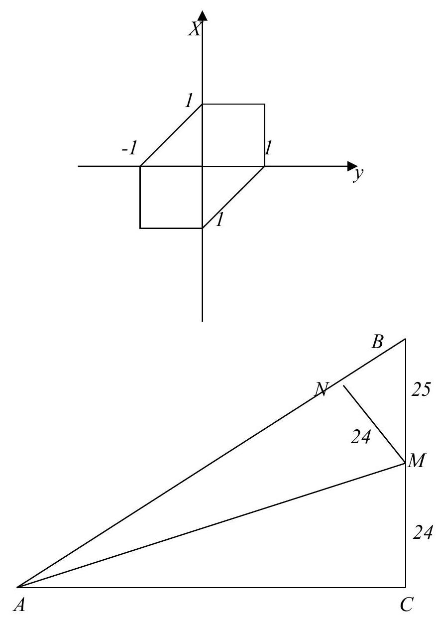🔑:Answer: The length of the circumscribed circle is c=175 pi.## SolutionDrop a perpendicular from point M to the hypotenuse. Triangles A C M and A M N are equal by hypotenuse and acute angle. Then M N=24 cm, and by the Pythagorean theorem, N B=7 cm. From the similarity of right triangles A B C and M N B, we get frac{A B}{B M}=frac{B C}{B N} ; quad frac{A B}{25}=frac{49}{7}. Therefore, the hypotenuse is 175 cm. Since the hypotenuse is the diameter of the circumscribed circle, c=175 pi.