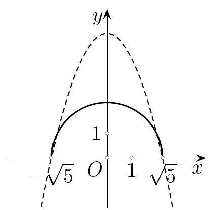 🔑:B1. The core function is defined for 5-x^{2} geq 0. If we factorize 5-x^{2}, we get (sqrt{5}-x)(sqrt{5}+x) geq 0. From the graph, we can see for which values of the variable x the function y=5-x^{2} is non-negative: [-sqrt{5}, sqrt{5}].The graph of the function f(x)=sqrt{5-x^{2}} is drawn with a solid line, and the graph of the function y=5-x^{2} is drawn with a dashed line.Writing the condition 5-x^{2} geq 0 1 point Factorization (sqrt{5}-x)(sqrt{5}+x) geq 0 1 point![](https://cdn.mathpix.com/cropped/2024_06_07_8d4f73ada7862f989e67g-14.jpg?height=415&width=420&top_left_y=889&top_left_x=1495)Zeros written: x_{1}=sqrt{5} 1 pointx_{2}=-sqrt{5}1 pointAppropriate sketch 1 pointSolution: [-sqrt{5}, sqrt{5}] 1 point