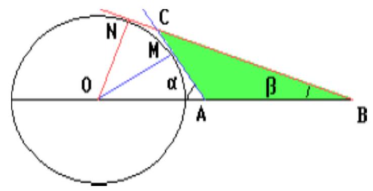 🔑:Apply the Law of Sines to triangle ABC.## SolutionLet M and N be the points of tangency of the circle with the lines passing through points A and B respectively,angle O A M=alpha, angle O B N=beta. Thenfrac{O M}{O A}=sin alpha, frac{O N}{O B}=sin betaTherefore,begin{gathered}sin alpha=frac{4}{5}, sin beta=frac{3}{5}, cos alpha=frac{3}{5}, cos beta=frac{4}{5} B C=frac{A B sin alpha}{sin (alpha-beta)}=frac{A B sin alpha}{sin alpha cos beta-cos alpha sin beta}=frac{100}{7}end{gathered}Thus,S_{triangle mathrm{ABC}}=frac{1}{2} A B cdot B C sin angle A B C=frac{1}{2} cdot 5 cdot frac{100}{7} cdot frac{3}{5}=frac{150}{7}## Answerfrac{150}{7}.