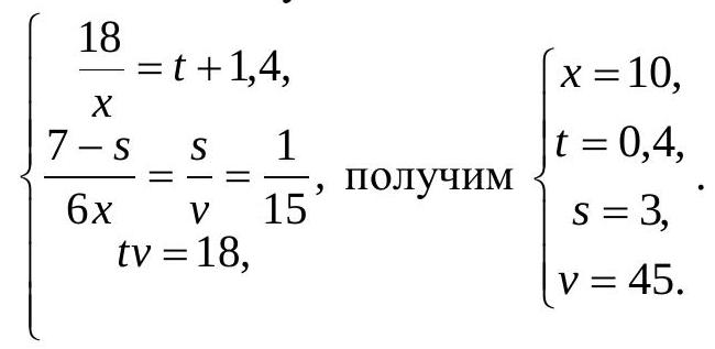 ❓:Task 4. (20 points) To get from the first to the second building of the university, Sasha took a car-sharing vehicle, while Valya rented a scooter. Sasha and Valya set off from the first building to the second at the same time, and at the same time, teacher Sergei Vladimirovich set off from the second building to the first in a car. The cars met after 4 minutes, and the scooter and the teacher's car met 1 km from the main building. Find the speeds of the cars and the scooter, if the scooter takes 1.4 hours longer to cover a distance of 18 km compared to the car-sharing vehicle, and its speed is 6 times less than the speed of Sergei Vladimirovich's car. In your answer, indicate the speeds in frac{kappa M}{psi} in ascending order.