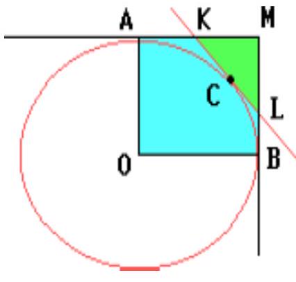 ❓:[ Two tangents drawn from one point ]Given a circle of radius 1. From an external point M, two perpendicular tangents MA and MB are drawn to the circle. Between the points of tangency A and B on the smaller arc AB, a point C is taken, and a third tangent KL is drawn through it, forming a triangle KLM with the tangents MA and MB. Find the perimeter of this triangle.
