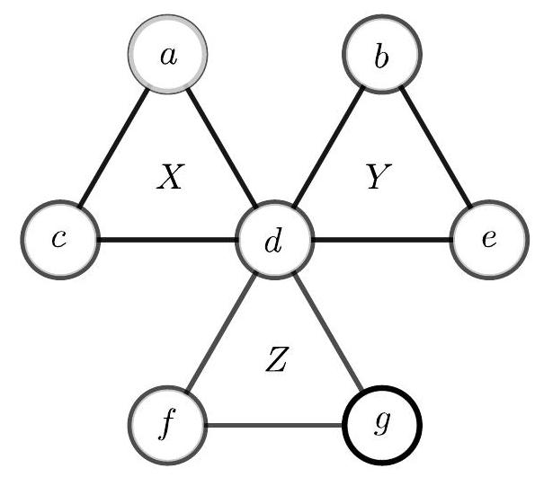 🔑:SolutionLet's denote the numbers that will be written in the circles by the letters a, b, c, d, e, f and g, as shown in the figure below.Suppose the three consecutive numbers obtained from the sums of the vertices of triangles X, Y and Z are k, k+1 and k+2. Thus,begin{aligned}3 k+3 & =k+(k+1)+(k+2) & =(a+c+d)+(b+d+e)+(d+f+g) & =(a+b+c+d+e+f+g)+2 dend{aligned}Since in the 7 circles we must find each number from the set {1,2,3,4,5,6,7}, thena+b+c+d+e+f+g=1+2+3+4+5+6+7=28Therefore,3 k+3=28+2 dSince the left-hand side of this equation is an integer multiple of 3, the same must be true for the right-hand side. Substituting the possible values of d, we have the following options for 28+2 d:2 cdot 1+28,2 cdot 2+28,2 cdot 3+28,2 cdot 4+28,2 cdot 5+28,2 cdot 6+28,2 cdot 7+28In this list, only 2 cdot 1+28,2 cdot 4+28 and 2 cdot 7+28 are multiples of 3, so in principle, d can only be 1, 4, or 7 (note that all leave a remainder of 1 when divided by 3). To show that these values of d are admissible, for each of them, we need to exhibit an example of a configuration satisfying the statement. From the last equation, we can conclude thatbegin{aligned}& d=1 quad rightarrow quad k=9 & d=4 quad rightarrow quad k=11 & d=7 quad rightarrow quad k=13end{aligned}