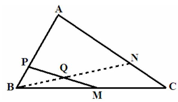 🧠:[<think>Okay, let's tackle part (a) first. So, we have triangle ABC with points M, N, P defined by certain vector relationships. We need to show expressions for vectors BN and BQ. Starting with BN. The problem states that vector AN is twice vector NC. So, point N divides AC in the ratio 2:1. That means N is closer to C. Wait, but how do I express BN in terms of BC and BA?Maybe I can express everything in terms of position vectors with respect to point B. Let's set B as the origin for simplicity. Then, the position vectors of other points can be written relative to B. Let me denote the position vectors of A, B, C as a, 0, c respectively. But wait, if B is the origin, then the position vector of B is 0, so vectors BA and BC would just be a and c respectively. Now, point N is such that AN = 2 NC. So, starting from A to N to C, the ratio is 2:1. So, N divides AC in the ratio AN:NC = 2:1. Therefore, the position vector of N can be found using the section formula. If I recall, if a point divides a line segment between two points in a ratio m:n, then the position vector is (n*vector1 + m*vector2)/(m + n). So here, since N divides AC in the ratio AN:NC = 2:1, starting from A, so m=2, n=1. Therefore, position vector of N is (1*A + 2*C)/3. But since A is a and C is c, then the position vector of N is ( a + 2c ) / 3. But wait, we need vector BN. Since B is the origin, the vector BN is just the position vector of N, right? Because BN = N - B = N - 0 = N. So yes, vector BN is ( a + 2c ) / 3. But the problem says to express it as (2/3)BC + (1/3)BA. Wait, let's check. Vector BC is c - 0 = c, and vector BA is a - 0 = a. So (2/3)BC + (1/3)BA is (2/3)c + (1/3)a, which is the same as ( a + 2c ) / 3. So that's correct. Therefore, the first part of (a) is done. Now, moving on to vector BQ. Q is the midpoint of PM. Let's first find vectors PM. Points P and M need to be determined. Point M is such that vector BM = vector MC. That means M is the midpoint of BC. So BM = MC, so M divides BC in half. Therefore, position vector of M is ( c ) / 2, since B is the origin. Wait, if B is origin, then position vector of C is c, so midpoint M would have position vector ( 0 + c ) / 2 = c/2. Point P is such that vector AP = 3 vector PB. So AP:PB = 3:1. Therefore, P divides AB in the ratio AP:PB = 3:1. Since AB is from A(a) to B(0), then position vector of P is (1*A + 3*B)/4 = ( a + 3*0 ) / 4 = a/4. So position vectors:- M is c/2- P is a/4Now, Q is the midpoint of PM. So, position vector of Q is (P + M)/2 = ( a/4 + c/2 ) / 2 = ( a/4 + c/2 ) divided by 2. Let's compute that:( a/4 + c/2 ) / 2 = ( a/4 + 2c/4 ) / 2 = ( ( a + 2c ) / 4 ) / 2 = ( a + 2c ) / 8 = a/8 + c/4. Therefore, vector BQ is the position vector of Q, which is a/8 + c/4. But the problem says it should be (1/4)BC + (1/8)BA. Let's check. BC is c, BA is a. So (1/4)c + (1/8)a is the same as a/8 + c/4. Perfect, that matches. So part (a) is done. Now part (b): Prove that points B, Q, N are collinear and find the ratio BQ/QN. To show collinearity, we can show that vectors BQ and BN are scalar multiples of each other, meaning Q lies on BN. We already have expressions for BQ and BN from part (a):- BN = (2/3)c + (1/3)a- BQ = (1/4)c + (1/8)aLet's see if BQ is a scalar multiple of BN. Let's suppose BQ = k * BN. Then:(1/4)c + (1/8)a = k*( (2/3)c + (1/3)a )Equating coefficients:For c: 1/4 = (2/3)kFor a: 1/8 = (1/3)kSolving for k from the c component: k = (1/4) / (2/3) = (1/4)*(3/2) = 3/8From the a component: k = (1/8) / (1/3) = (1/8)*(3/1) = 3/8Both give k = 3/8. Therefore, BQ = (3/8) BN. Hence, vectors BQ and BN are scalar multiples, so points B, Q, N are collinear. Now, ratio BQ/QN. Since BQ = (3/8) BN, then Q divides BN in the ratio BQ:QN = 3/8 : (1 - 3/8) = 3/8 : 5/8 = 3:5. Wait, but that seems contradictory. Wait, if BQ = 3/8 BN, then QN = BN - BQ = BN - 3/8 BN = 5/8 BN. So BQ/QN = (3/8)/(5/8) = 3/5. So the ratio is 3:5. But wait, hold on. Let me verify. If vectorially, Q is located 3/8 along the vector BN from B, then the length from B to Q is 3/8 of BN, and from Q to N is the remaining 5/8. Therefore, the ratio BQ:QN is 3:5, so the ratio BQ/QN is 3/5. Therefore, the value is 3/5. Wait, let's check another way. Since Q is on BN such that BQ = 3/8 BN, then QN = BN - BQ = 5/8 BN. Therefore, BQ/QN = 3/5. Alternatively, since BQ = 3/8 BN and QN = 5/8 BN, the ratio is 3:5. So the answer is 3/5. Let me just recap the steps to make sure I didn't make a mistake. For collinearity: showed that BQ is a scalar multiple of BN. Calculated scalar k = 3/8. Then, since Q is between B and N, the ratio is BQ:QN = 3:5. Yes, that seems right. Final Answera) boxed{overrightarrow{BN} = frac{2}{3} overrightarrow{BC} + frac{1}{3} overrightarrow{BA}} and boxed{overrightarrow{BQ} = frac{1}{4} overrightarrow{BC} + frac{1}{8} overrightarrow{BA}};b) The points are collinear and the ratio is boxed{dfrac{3}{5}}.</think>To solve part (a), we start by expressing the vectors (overrightarrow{BN}) and (overrightarrow{BQ}) in terms of (overrightarrow{BC}) and (overrightarrow{BA}).1. Finding (overrightarrow{BN}): - Point (N) divides (AC) in the ratio 2:1. Using the section formula, the position vector of (N) is (frac{1}{3}overrightarrow{BA} + frac{2}{3}overrightarrow{BC}). - Therefore, (overrightarrow{BN} = frac{2}{3}overrightarrow{BC} + frac{1}{3}overrightarrow{BA}).2. Finding (overrightarrow{BQ}): - Point (M) is the midpoint of (BC), so its position vector is (frac{1}{2}overrightarrow{BC}). - Point (P) divides (AB) in the ratio 3:1, so its position vector is (frac{1}{4}overrightarrow{BA}). - Point (Q) is the midpoint of (PM), so its position vector is (frac{1}{2}(frac{1}{4}overrightarrow{BA} + frac{1}{2}overrightarrow{BC})). - Simplifying, (overrightarrow{BQ} = frac{1}{8}overrightarrow{BA} + frac{1}{4}overrightarrow{BC}).For part (b), we need to prove that points (B), (Q), and (N) are collinear and find the ratio (frac{BQ}{QN}).1. Collinearity Check: - We show that (overrightarrow{BQ}) is a scalar mul