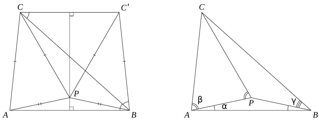 🔑:Answer: 30^{circ}.Solution 1. Draw the perpendicular bisector of side A B. Obviously, it will pass through point P. Let C^{prime} be the point symmetric to C with respect to this perpendicular (see the left figure). By symmetry, angle C^{prime} B A = angle C A B = 2 angle A B C, hence angle C^{prime} B C = angle A B C. On the other hand, lines C C^{prime} and A B are parallel, so angle A B C = angle B C C^{prime}. Therefore, angle B C C^{prime} = angle C^{prime} B C, triangle B C^{prime} C is isosceles, and B C^{prime} = C^{prime} C. By symmetry, B C^{prime} = A C and C P = C^{prime} P, and by the condition A C = C P. Thus,C^{prime} P = C P = A C = B C^{prime} = C^{prime} Cand triangle P C C^{prime} is equilateral. Therefore, angle C C^{prime} P = 60^{circ}. Note that180^{circ} - 2 angle P B C^{prime} = angle P C^{prime} B = angle B C^{prime} C - 60^{circ} = 120^{circ} - 2 angle C B C^{prime}Therefore,angle C B P = angle P B C^{prime} - angle C B C^{prime} = frac{1}{2} left(180^{circ} - 120^{circ}right) = 30^{circ}.Solution 2. Let alpha = angle P A B, beta = angle P A C, gamma = angle P B C, varphi = alpha + gamma (see the right figure). By the condition, angle P B A = alpha, angle C P A = beta, andalpha + beta = 2 varphi = 2(alpha + gamma) Longleftrightarrow 2 gamma = beta - alphaBy the Law of Sines,frac{A C}{sin varphi} = frac{A B}{sin left(180^{circ} - 3 varphiright)} Longleftrightarrow frac{sin 3 varphi}{sin varphi} = frac{A B}{A C}Note thatA B = 2 A P cos alpha = 4 A C cos alpha cos beta Longleftrightarrow frac{A B}{A C} = 2(cos (alpha + beta) + cos (beta - alpha)) = 2 cos 2 varphi + 2 cos 2 gammaMoreover,frac{sin 3 varphi}{sin varphi} = 3 - 4 sin^2 varphi = 2 cos 2 varphi + 1Therefore,2 cos 2 varphi + 2 cos 2 gamma = 2 cos 2 varphi + 1 Longleftrightarrow cos 2 gamma = frac{1}{2} Longleftrightarrow 2 gamma = 60^{circ} Longleftrightarrow gamma = 30^{circ}