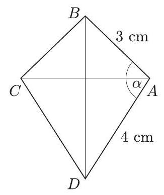 🔑:Solution. Let A B=B C=3 mathrm{~cm}, C D=D A=4 mathrm{~cm}. The area of triangle A B D,t=frac{3 cdot 4 cdot sin alpha}{2}is half the area of the kite, so the area of the kite is: 12 cdot sin alpha. This is maximized when sin alpha=1, hence alpha=90^{circ} and T=12 mathrm{~cm}^{2}.Figure 1The maximum achievable area value is half6=3 cdot 4 cdot sin alphafrom which sin alpha=frac{1}{2}. The two values for alpha are alpha_{1}=30^{circ}, alpha_{2}=150^{circ}.We know that the height of an equilateral triangle with a side length of 4 mathrm{~cm} is 2 sqrt{3}>3, so in the triangle with two sides of 4 mathrm{~cm} and 3 mathrm{~cm} and an included angle of 30^{circ}, the angle opposite the 4 mathrm{~cm} side is obtuse. This means that when alpha=30^{circ}, the kite is concave, while when alpha=150^{circ}, it is convex (Figure 2). According to the problem statement, we need to determine the diagonals of the latter quadrilateral.Figure 2Let's calculate the lengths of the diagonals using the cosine rule:B D^{2}=3^{2}+4^{2}-2 cdot 3 cdot 4 cdot cos 150^{circ}from whichB D=sqrt{25+12 sqrt{3}} approx 6.766The area of the kite is t=frac{A C cdot B D}{2}. Substitute the values of t and B D and solve for A C:A C=frac{2 t}{B D}=frac{2 cdot 6}{sqrt{25+12 sqrt{3}}}=frac{12 cdot sqrt{193} cdot sqrt{25-12 sqrt{3}}}{193} approx 1.773Note. Some solvers overlooked that the conditions are satisfied by two kites, but the problem statement only refers to the convex kite.