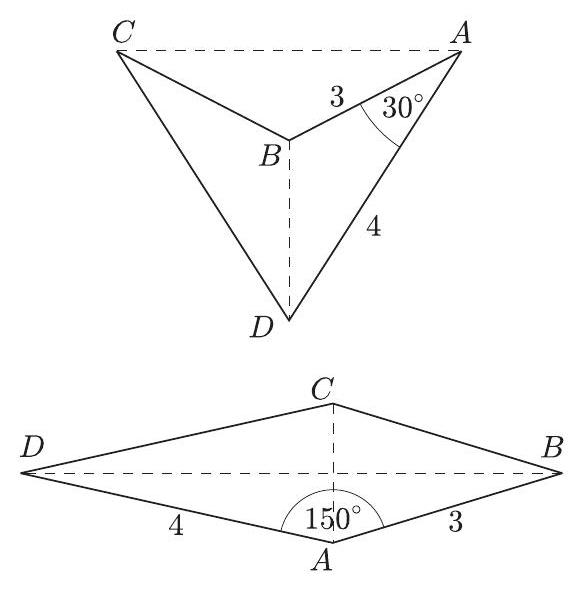 ❓:A "knobbed" deltoid has sides of 3 mathrm{~cm} and 4 mathrm{~cm}. Its angles are variable. What is the length of the diagonals of the convex deltoid if its area is half of the maximum possible value?