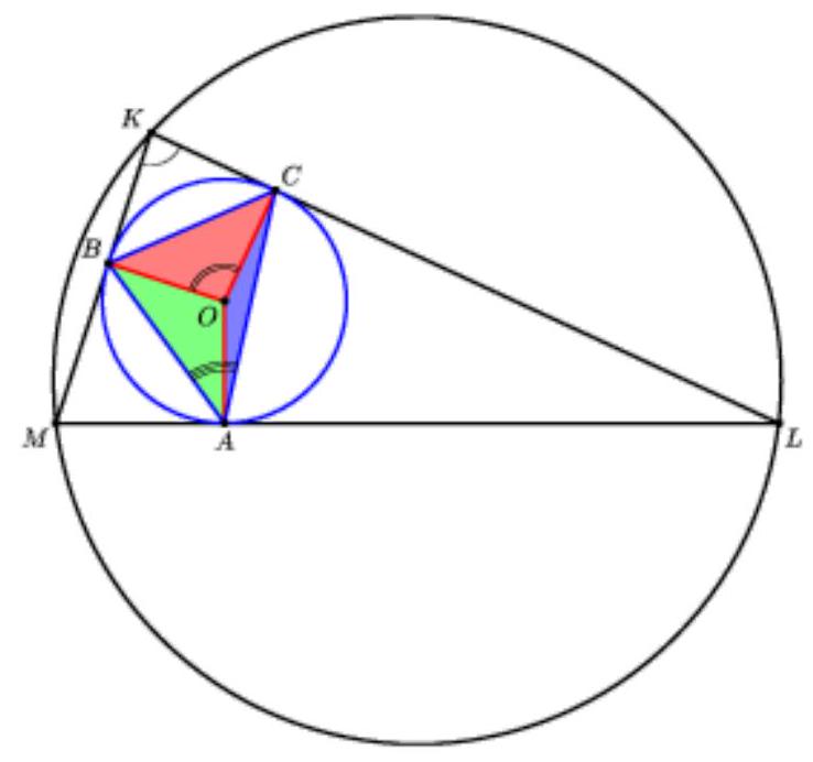 🔑:Let O be the center of the circle inscribed in triangle KLM. Then point O lies inside triangle ABC andS_{triangle mathrm{ABC}}=S_{triangle mathrm{BOC}}+S_{triangle mathrm{AOC}}+S_{triangle mathrm{AOB}}.Next, apply the Law of Sines and formulas for the area of a triangle.## SolutionLet the vertices A, B, and C of triangle ABC lie on the sides ML, KM, and KL of triangle KLM respectively; O be the center of the circle with radius r inscribed in triangle KLM, and R be the radius of the circumcircle of this triangle. DenoteML=a, KM=b, KL=c, angle LKM=alpha, angle KLM=beta, angle LMK=gammaThenangle BAC=90^{circ}-frac{alpha}{2}<90^{circ}, angle ABC=90^{circ}-frac{beta}{2}<90^{circ}, angle ACB=90^{circ}-frac{gamma}{2}<90^{circ}.Since all angles of triangle ABC are acute, the center O of the circumcircle of triangle ABC lies inside this triangle. Therefore,S_{triangle mathrm{ABC}}=S_{triangle mathrm{BOC}}+S_{triangle mathrm{AOC}}+S_{triangle mathrm{AOB}}=begin{gathered}=frac{1}{2} cdot OB cdot OC cdot sin left(180^{circ}-alpharight)+frac{1}{2} cdot OA cdot OC cdot sin left(180^{circ}-betaright)+frac{1}{2} cdot OA cdot OB cdot sin left(180^{circ}-gammaright)= =frac{1}{2}(r cdot r cdot sin alpha+r cdot r cdot sin beta+r cdot r cdot sin gamma)=frac{1}{2} r^{2}(sin alpha+sin beta+sin gamma)end{gathered}SinceS_{Delta mathrm{KLM}}=frac{1}{2} cdot KL cdot KM cdot sin angle LKM=frac{1}{2} bc sin alphathenbegin{gathered}frac{S_{triangle ABC}}{S_{triangle KLM}}=frac{frac{1}{2} r^{2}(sin alpha+sin beta+sin gamma)}{frac{1}{2} bc sin alpha}=frac{r^{2}}{bc} cdotleft(1+frac{sin beta}{sin alpha}+frac{sin gamma}{sin alpha}right)= =frac{r^{2}}{bc} cdotleft(1+frac{b}{a}+frac{c}{a}right)=frac{r^{2}(a+b+c)}{abc}end{gathered}SinceS_{Delta mathrm{KLM}}=frac{a+b+c}{2} cdot r text{ and } S_{Delta mathrm{KLM}}=frac{abc}{4R}thena+b+c=frac{2 S_{Delta KLM}}{r}, text{ and } abc=4 S_{Delta mathrm{KLM}} cdot RThus,frac{S_{triangle ABC}}{S_{triangle KLM}}=frac{r^{2} cdot frac{2 S_{triangle KLM}}{r}}{S_{triangle KLM} cdot 4R}=frac{r}{2R}=frac{1}{6}Therefore, frac{S_{triangle KLM}}{S_{triangle ABC}}=6.## Answer6.00## Answer40^{circ}.The diagonals of the convex quadrilateral ABCD intersect at point E, BC=CD, AC is the angle bisector of angle A, angle BCD=160^{circ}, angle CED=130^{circ}. Find the angle angle ABD.