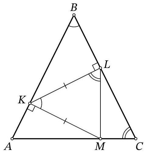 ❓:Problem 7.2. (15 points) Given an isosceles triangle A B C(A B=B C). On the sides A B, B C, A C points K, L, M are marked respectively such that angle A K M=90^{circ}, angle B L K=90^{circ} and K M=K L. What is the measure of angle C M L ?