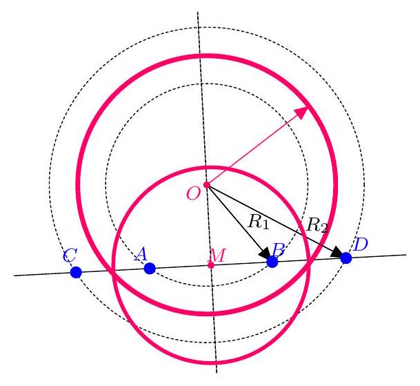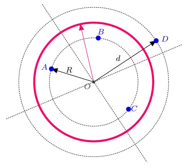 🔑:Solution to Exercise 6: Let mathcal{C} be a circle passing at equal distance from A, B, C, D. The four points cannot all be inside the circle, otherwise they would be equidistant from the center, and thus would be concyclic. Similarly, they cannot all be outside.Determine the number of circles mathcal{C} passing at equal distance from A, B, C, D such that A, B, C are on the same side of the circle. Suppose A, B, C are not collinear. Let Omega be the center of the circumcircle of A, B, C and R its radius. Let r be the radius of mathcal{C} and d = Omega D. The fact that A, B, C, D are equidistant from mathcal{C} can be written as |r - R| = |r - d|. Moreover, r - R and r - d cannot be equal, otherwise we would have d = R and A, B, C, D would be concyclic. The equality |r - R| = |r - d| is therefore equivalent to r - R = d - r, or r = frac{R + d}{2}, which proves the existence and uniqueness of the circle mathcal{C}_{D} such that A, B, C are on one side and D on the other side of the circle.(If A, B, C are collinear, no point is equidistant from A, B, C, so there does not exist a circle passing at equal distance from A, B, C such that A, B, C are all on the same side of the circle.)We similarly define the circles mathcal{C}_{A}, mathcal{C}_{B}, and mathcal{C}_{C} if they exist.Determine the number of circles mathcal{C} passing at equal distance from A, B, C, D such that A, B are on one side and C, D on the other. The center of mathcal{C} must be equidistant from A and B, so it lies on the perpendicular bisector of [A B]. Similarly, it lies on the perpendicular bisector of [C D].Suppose that (A B) and (C D) are not parallel. Then the perpendicular bisectors of [A B] and [C D] intersect at a point Omega. Let R_{1} = Omega A and R_{2} = Omega C. Then R_{1} neq R_{2} because A, B, C, D are not concyclic. As in the previous case, we see that the circle with center Omega and radius frac{R_{1} + R_{2}}{2} is the unique circle equidistant from A and B such that A and B are on one side and C, D on the other. Denote it by mathcal{C}_{A B}.Suppose that the perpendicular bisectors of [A B] and [C D] are parallel but not coincident. Then there does not exist a circle equidistant from A, B, C, D such that A, B are on one side and C, D on the other.Suppose that the perpendicular bisectors of [A B] and [C D] are coincident. If A, B, C, D are not collinear, then the perpendicular bisectors of [A B] and [A C] intersect at a point Omega which is equidistant from A, B, C, D, which contradicts the fact that A, B, C, D are not concyclic.Suppose that A, B, C, D are collinear such that the midpoints of [A B] and [C D] are coincident. Then there are infinitely many circles passing at equal distance from A, B, C, D, with centers on the common perpendicular bisector.The discussion above shows that, except in the special case where the four points are collinear such that the midpoint of two points is equal to the midpoint of the other two, there are at most 7 circles passing at equal distance from A, B, C, D: these are mathcal{C}_{A}, mathcal{C}_{B}, mathcal{C}_{C}, mathcal{C}_{D}, mathcal{C}_{A B}, mathcal{C}_{A C}, mathcal{C}_{A D}. Equality holds when any two of the six lines determined by A, B, C, D are not parallel.