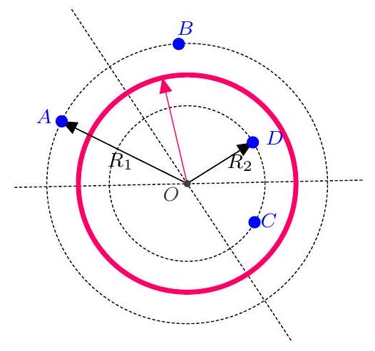 🧠:[<think>Okay, so I need to figure out the maximum number of circles that can pass at equal distance from four non-cyclic points A, B, C, D. Hmm, let me start by understanding the problem better. First, the definition says the distance from a point P to a circle C is the minimum distance from P to any point on C. So, if I have a circle, and a point, the distance from the point to the circle is either zero if the point is on the circle, or the absolute value of the difference between the radius and the distance from the point to the center of the circle. For example, if the point is inside the circle, the distance to the circle would be the radius minus the distance from the center to the point. If the point is outside, it would be the distance from the point to the center minus the radius. Right?So, given four points that are not all on a circle (non-cyclic), we need to find circles such that each of these four points is at the same distance from the circle. The question is asking for the maximum number of such circles possible.Let me try to visualize this. For a single point, the set of circles at a fixed distance from that point would be all circles whose centers are at a distance d + r from the point, where d is the fixed distance and r is the radius? Wait, maybe I need to rephrase that.Wait, the distance from a point P to a circle with center O and radius r is |OP| - r if P is outside the circle, and r - |OP| if P is inside the circle. So, if we fix the distance from P to the circle as some value d, then for circles where P is outside, we have |OP| - r = d, so |OP| = r + d. For circles where P is inside, we have r - |OP| = d, so |OP| = r - d. But in both cases, the center O lies on a circle around P with radius r ± d. Wait, but we don't know r. So maybe we can fix d and then for each point, the centers of circles at distance d from P would lie on two circles: one with radius r + d and another with radius r - d. Hmm, no, actually, for each point, if the distance from the point to the circle is d, then the center of such a circle must lie on a circle centered at P with radius r + d or r - d. But since r is the radius of the original circle we're considering, this seems a bit circular.Wait, perhaps another approach: if the distance from point P to circle C is d, then the center of circle C must lie either on a circle centered at P with radius r + d (if P is outside C) or on a circle centered at P with radius r - d (if P is inside C). But here, both the radius r of circle C and the distance d are variables. So, if we fix d, the possible centers O of circle C must lie on one of two circles for each point: either OP = r + d or OP = r - d. But since r is the radius of the circle C, which is variable, perhaps this complicates things.Alternatively, if we consider d as fixed, then for each point, the set of centers O of circles C with radius r such that the distance from P to C is d. But since d is fixed, for each point P_i, we can write either OP_i = r + d (if P is outside) or OP_i = r - d (if P is inside). So, for each point, the center O must lie on a circle of radius r + d around P_i or a circle of radius r - d around P_i. However, since r is the same for all points (since we're considering a single circle C), this gives us a system of equations where O must lie on the intersection of these circles for all four points.Wait, but the problem is asking for circles that pass at equal distance from all four points. So, the same distance d from each of the four points. So, the circle C must be such that each of the four points A, B, C, D has the same distance to C, which is d. Therefore, for each point, the center O of circle C must satisfy either OA = r + d, OB = r + d, OC = r + d, OD = r + d (if all points are outside C) or OA = r - d, OB = r - d, etc. (if all points are inside C). However, it's also possible that some points are inside and some are outside, but in that case, the distance from the point to the circle would be d = r - OP for points inside and d = OP - r for points outside. Therefore, if some points are inside and some are outside, we can't have the same d for all. For example, suppose point A is inside and point B is outside. Then d = r - OA and d = OB - r. Then adding these equations gives OA + OB = 2r. Similarly, for each point inside and outside, we get a relation between their distances to the center and the radius. However, if we have some points inside and some outside, the system may not have a solution. Therefore, perhaps all points must lie either all inside or all outside the circle C for their distances to C to be equal. But let's check.Wait, suppose point A is inside C and point B is outside C. Then the distance from A to C is r - OA = d, and the distance from B to C is OB - r = d. So, r - OA = OB - r, which gives 2r = OA + OB. So, if we have two points, one inside and one outside, the radius is determined as the average of their distances from the center. If we have more points, some inside and some outside, then similar equations would hold. However, for four points, if some are inside and some are outside, we would need multiple equations that might be inconsistent. For instance, if points A and B are inside and points C and D are outside, then we would have r - OA = d, r - OB = d, OC - r = d, OD - r = d. Then OA = r - d, OB = r - d, OC = r + d, OD = r + d. Therefore, the distances from the center O to the points would satisfy OA = OB = r - d and OC = OD = r + d. Therefore, such a center O must be equidistant from A and B, and equidistant from C and D. So, O lies on the perpendicular bisector of AB and on the perpendicular bisector of CD. The intersection of these two bisectors gives possible centers. Then, if such an intersection exists, we can determine r as OA + d = OC - d, so OA + d = OC - d => OC - OA = 2d. Therefore, if the distance from O to C minus the distance from O to A is 2d, which must be positive, so OC > OA. Similarly, since OA = OB and OC = O
