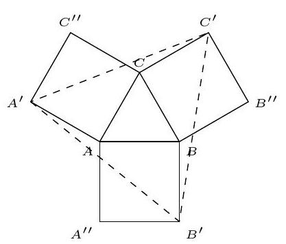 🧠:[<think>Okay, let me try to figure out the perimeter of triangle A'B'C'. The problem says that on the sides of an equilateral triangle ABC with side length 1, three squares are constructed. Then we need to find the perimeter of triangle A'B'C'. The answer choices are given, so maybe that can help me check my work as I go along.First, since ABC is an equilateral triangle with side length 1, all sides are 1, and all angles are 60 degrees. The squares are constructed on each side. When they say "constructed on the sides," I imagine that each square is built outward from the triangle, right? So each side of the triangle is one side of a square. For example, side AB is one side of a square, BC is another square, and CA is the third square. Then the figure probably connects the outer vertices of these squares to form triangle A'B'C'. But since I don't have the figure, I need to visualize it.Let me sketch a mental picture. Let's take an equilateral triangle ABC. On each side, construct a square outwardly. So each square has one side coinciding with a side of the triangle. Then, the triangle A'B'C' is formed by connecting the outer vertices of these squares. So for each side of ABC, the square built on it will have two new vertices. But when connecting A', B', C', maybe each corner of the new triangle is a vertex from each square? Wait, but each square has four vertices. One side is shared with the triangle ABC, so the other three vertices of the square are new. But since the triangle is equilateral, and the squares are constructed on each side, maybe each A', B', C' is the outer vertex of each square, not attached to the original triangle.Wait, for example, take side AB. The square constructed on AB would have vertices A, B, a new point, say D, and another new point, say E. Then, similarly for the other sides. But if A', B', C' are the outer vertices of the squares (the ones not on the original triangle), then A' would be the vertex opposite to AB in the square on AB, B' opposite to BC, and C' opposite to CA. Then triangle A'B'C' is formed by connecting these three outer vertices.So to find the perimeter of A'B'C', we need to find the lengths of A'B', B'C', and C'A'.Each of these sides would be the distance between two outer vertices of the squares. To compute this, I need to figure out the coordinates of A', B', and C', then compute the distances.Maybe coordinate geometry would help here. Let's assign coordinates to triangle ABC first. Let me place point A at (0, 0), point B at (1, 0). Since ABC is equilateral, point C will be at (0.5, sqrt(3)/2). Let me confirm that. In an equilateral triangle with side length 1, the height is sqrt(3)/2, so yes, point C is at (0.5, sqrt(3)/2).Now, construct squares on each side. Let's start with side AB. The square on AB. Since AB is from (0,0) to (1,0), the square can be constructed either above or below the triangle. Since the figure is probably constructed outward, and given that the original triangle is already above AB, maybe the square is constructed below AB. Wait, but if ABC is equilateral, then all squares are constructed outward from the triangle. Hmm. Wait, in which direction? The problem says "as shown in the figure," but I don't have the figure. Hmm.But given that it's a standard problem, likely the squares are constructed externally on each side. So for each side, the square is built outward, away from the triangle. So for side AB, which is horizontal from (0,0) to (1,0), the square constructed outward (downward) would have vertices at A(0,0), B(1,0), (1,-1), (0,-1). But that's if we build it downward. Alternatively, upward, but the original triangle is upward. Wait, but since ABC is an equilateral triangle above AB, then building the square on AB outward would be either upward or downward. But if we build it in the direction opposite to the triangle, which is downward, then the square is below AB. But then the other squares on BC and AC would be built outward from the triangle as well.But maybe all squares are constructed in the same rotational direction. Let me think. If we construct squares on each side in a consistent way, say, all to the outside of the triangle. For an equilateral triangle, each side's square would be constructed in such a way that the square is external to the triangle.Alternatively, perhaps they are constructed in a way that each square is on the "outside" relative to the triangle. So for side AB, the square is constructed outside the triangle, which would be below AB. For side BC, the square is constructed outside the triangle, which would be to the right of BC, and for side AC, outside the triangle, which would be to the left of AC.But regardless of the direction, the key is to figure out the coordinates of A', B', C' based on the squares.Alternatively, maybe each square is constructed in such a way that the angle between the triangle and the square is maintained. Since each angle in the equilateral triangle is 60 degrees, constructing a square on each side would create 90-degree angles adjacent to the 60-degree angles. Hmm, but how exactly?Alternatively, perhaps the squares are built on the sides, extending outward, so that each square shares a side with the triangle, and the squares are on the exterior of the triangle. Then, the vertices A', B', C' are the free vertices of each square, not connected to the original triangle. Then, connecting these free vertices forms triangle A’B’C’.To model this, let's assign coordinates and compute each A', B', C'.Let me fix coordinate system.Let me place point A at (0,0), point B at (1,0), point C at (0.5, sqrt(3)/2).First, construct the square on side AB. The side AB is from (0,0) to (1,0). To construct the square outward from the triangle, since the triangle is above AB, the square would be constructed below AB. So starting from A(0,0) to B(1,0), then turning 90 degrees downward. The square on AB would have vertices A(0,0), B(1,0), (1,-1), (0,-1). So the outer vertex h