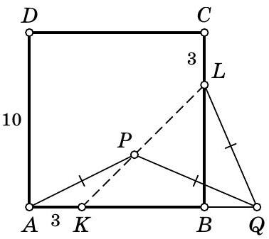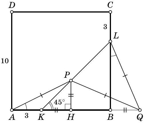 🔑:Solution. Drop a perpendicular PH from point P to side AB. Since triangle KBL is isosceles and right-angled, angle PKH = 45^circ. Therefore, triangle KPH is also isosceles and KH = HP.Notice that right triangles APH and LQB are equal by hypotenuse (AP = LQ) and acute angle (angle PAH = angle BLQ). Therefore, KH = PH = BQ.Since PH is the height in the isosceles triangle APQ drawn to its base, it is also the median. Then AH = HQ and we can write the following relationship:[begin{gathered}AB + BQ = AQ = 2AH = 2(AK + KH) = 2(AK + BQ) 10 + BQ = 2(3 + BQ) = 6 + 2BQend{gathered}]from which BQ = 4.