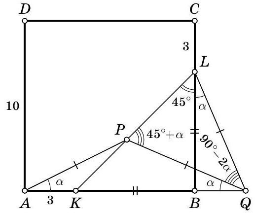 🧠:[<think>Alright, let me try to tackle this problem step by step. First, let's make sure I understand the setup correctly.We have a square ABCD with side length 10. Points K and L are on sides AB and BC respectively, such that AK = CL = 3. So, since AB is 10, then KB = AB - AK = 10 - 3 = 7. Similarly, BC is 10, and since CL = 3, then BL = BC - CL = 10 - 3 = 7. Therefore, KB = BL = 7. That's interesting; triangle KBL might be something special here.Then, on segment KL, there's a point P. On the extension of AB beyond point B, there's a point Q such that AP = PQ = QL. So Q is somewhere past B on the line AB extended. The problem has two parts: part a) asks to prove that angle PAB is equal to angle BLQ, and part b) asks for the length of segment BQ. The solution for part a) is provided, and part b)'s answer is 4. But I need to figure out how to get there.Starting with part a). The given solution mentions that triangle KBL is isosceles and right-angled. Let me confirm that. Since K is on AB and L is on BC, and KB = BL = 7, then triangle KBL has two sides equal (KB and BL) each of length 7, and the angle at B is 90 degrees because ABCD is a square. Therefore, triangle KBL is indeed a right-angled isosceles triangle with legs of 7, so the hypotenuse KL would be 7√2. Then, the angles at K and L would each be 45 degrees. Wait, in a right-angled isosceles triangle, the two non-right angles are 45 degrees each. So angle at K is 45 degrees, angle at L is 45 degrees. Wait, but in the given solution, it's mentioned that angle KLB is 45 degrees. That makes sense because angle at L is 45 degrees in triangle KBL.Then, they let angle BLQ be alpha. Since triangle PQL is isosceles (because AP = PQ = QL, but actually AP = PQ = QL? Wait, the problem states that AP = PQ = QL. Wait, AP, PQ, QL are three segments such that each is equal. So point Q is on the extension of AB beyond B, point P is on KL. So AP is a segment from A to P, PQ is from P to Q, and QL is from Q to L. So AP = PQ = QL. Therefore, triangle PQL is not necessarily the triangle we might first think. Wait, if PQ = QL, then triangle PQL is isosceles with PQ = QL, so angles at P and L would be equal. Wait, but according to the solution, they say triangle PQL is isosceles, so maybe that's PQ = QL? Yes, because AP = PQ = QL, so PQ = QL. Therefore, triangle PQL has PQ = QL, so it's isosceles with base PL and equal sides PQ and QL. Therefore, angles at P and L are equal. The solution states angle LPQ = angle PLQ = 45 + alpha. Hmm.Wait, let's parse the given solution step by step.First, note that KB = BL = 7, so triangle KBL is isosceles and right-angled, so angle KLB = 45 degrees. Then, let angle BLQ = alpha. Since triangle PQL is isosceles (PQ = QL), angles at P and L are equal. Then, angle LPQ = angle PLQ = 45 + alpha. Wait, why 45 + alpha?Hmm, perhaps we need to consider the angles in triangle BLQ. Let's think. Since L is on BC, and Q is on the extension of AB beyond B, angle LBQ is 180 - 90 = 90 degrees? Wait, no. Let me sketch this mentally. Square ABCD, with AB horizontal. Point B is the bottom-right corner. BC is vertical. Point L is 7 units up from B on BC. Point Q is on the extension of AB beyond B, so to the right of B. So segment BL is vertical (since BC is vertical), and segment BQ is horizontal. So angle at B in triangle BLQ is angle between BL (vertical) and BQ (horizontal). So angle LBQ is 90 degrees. Therefore, triangle BLQ is a right triangle at B. Therefore, angle BLQ is alpha, which is angle at L. Then angle at Q is 90 - alpha. But in the given solution, they mention angle LQB = 90 - alpha. That makes sense.Then, considering triangle PQL. Since PQ = QL, angles at P and L are equal. But angle PLQ is given as 45 + alpha. Wait, angle at L in triangle PQL is angle PLQ. How is that 45 + alpha?Wait, angle KLB is 45 degrees, as established. So angle at L in triangle KBL is 45 degrees. Then, angle BLQ is alpha. So angle between KL and LQ is alpha. Therefore, angle PLQ would be angle between KL (which has a 45-degree angle at L) and LQ. If angle BLQ is alpha, then angle PLQ is 45 + alpha? Maybe. Wait, let's see.Point P is on KL. So from point L's perspective, line LK makes a 45-degree angle with LB (since triangle KBL is right-angled isosceles). Then, angle between LB and LQ is alpha (angle BLQ = alpha). Therefore, the angle between LK and LQ would be 45 degrees + alpha. Therefore, angle PLQ, which is the angle at L between LP and LQ, is 45 + alpha. Hence, in triangle PQL, angles at P and L are equal (since PQ = QL). Therefore, angle LPQ = angle PLQ = 45 + alpha. Then, the third angle in triangle PQL is angle PQL = 180 - 2*(45 + alpha) = 180 - 90 - 2 alpha = 90 - 2 alpha.Then, in triangle BLQ, which is right-angled at B, angle at Q is 90 - alpha (since angles in triangle add to 180, so angle at Q is 180 - 90 - alpha = 90 - alpha). The solution says angle LQB = 90 - alpha. Then, angle PQA is angle LQA - angle LQP. Wait, angle LQA is angle at Q between LQ and QA. Since Q is on the extension of AB beyond B, QA is a line from Q to A, passing through B. So angle LQA is the angle between LQ and QA. Since angle LQB is 90 - alpha, and QA is a straight line from Q through B to A, then angle between LQ and QA is the same as angle LQB, which is 90 - alpha. Then angle LQP is angle between LQ and QP. From triangle PQL, angle PQL is 90 - 2 alpha. So angle LQP is 90 - 2 alpha. Therefore, angle PQA = angle LQA - angle LQP = (90 - alpha) - (90 - 2 alpha) = alpha. Then, since triangle APQ is isosceles (AP = PQ), angles at Q and A are equal. Wait, AP = PQ, so triangle APQ has AP = PQ, so it's isosceles with base AQ. Therefore, angles at A and Q are equal. But angle PQA is alpha, so angle PAQ is also alpha. Therefore, angle PAB is alpha, which is equal to angle BLQ. Hence, angle PAB = angle BLQ, which is the required proof.Okay, that makes sense. So part a) is proven.Now part b) asks for the length of segment BQ. The answer is given as 4. Let's see how t