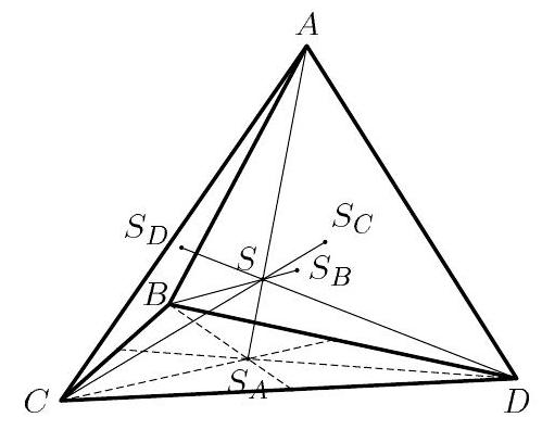 ❓:A tetrahedron has planes passing through each of its edges and the midpoint of the opposite edge. How many parts do these planes divide the tetrahedron into, and what is the volume of these parts?