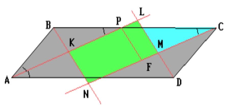 ❓:In parallelogram A B C D, where angle B A D equals 60^{circ}, A B=2, A D=5, the bisector of angle B A D intersects with the bisector of angle A B C at point K, with the bisector of angle C D A at point L, and the bisector of angle B C D intersects with the bisector of angle C D A at point M, with the bisector of angle A B C at point N. Find the ratio of the area of quadrilateral K L M N to the area of parallelogram A B C D.