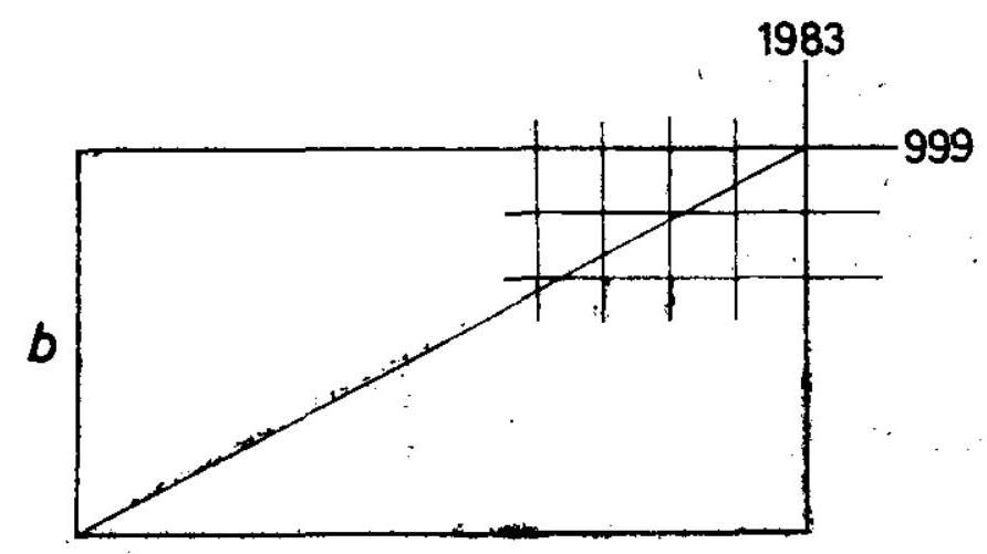 🔑:Every field that the diagonal crosses cuts a segment from the diagonal. The two endpoints of such a segment are the intersection points of the diagonal and the perimeter of the field. Therefore, we need to count how many segments the intersection points formed by the boundary lines of the fields divide the diagonal into.The number of vertical lines is 1984, which means 1984 intersection points. The 1000 horizontal lines intersect the diagonal at 1000 points, but among these points, there will be some - for example, the first or the last - where vertical lines also pass. These points - that is, the vertices where the diagonal passes through - have been counted twice.If the diagonal passes through a vertex, then the resulting rectangle is similar to the original, and if the side of the field is a unit, then its sides are also integers.For the sides, it holds thatfrac{a}{b}=frac{1983}{999} quad text { and } quad 1 leq a leq 1983Conversely, for every pair of integers (a, b) that satisfy (1), there is a rectangle, as shown in the diagram, or a vertex through which the diagonal of the chessboard passes.Since the greatest common divisor of 1983 and 999 is 3, from (1) we have (frac{a}{b}=frac{661}{333}), and this form cannot be simplified further. This means that (a) is an integer multiple of 661, and (b) is an integer multiple of 333. Moreover, (a leq 1983), so (1) has exactly 3 solutions, namelya=661, b=333 ; quad a=1322, b=666 quad a=1983, b=999Thus, the diagonal passes through four vertices in total, two of which are also vertices of the chessboard, and the other two are the trisection points of the diagonal.Therefore, the boundary lines of the fields intersect the diagonal line at (1984 + 1000 - 4 = 2980) points. The number of segments created is one less than this, so the diagonal of the chessboard passes through 2979 fields.Remarks. 1. In the solution, we also showed that if the sides of the chessboard are relatively prime, then the diagonal of the chessboard does not pass through any field vertex inside the board.2. It follows from the proof that the diagonal of a (k times n) chessboard passes through ((k+n+1)-d) fields, where (d) is the greatest common divisor of (k) and (n).