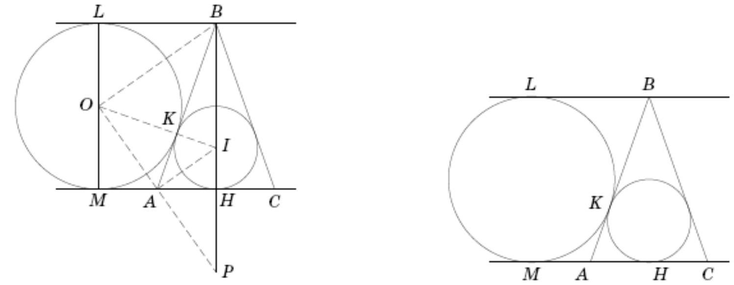 🔑:Let the circle Omega with radius 1 and center O touch the given lines at points L and M, and the side A B of triangle A B C at point K (see the left figure). By the problem's condition, the incircle of the triangle with center I touches the side A B at the same point K, and the base A C at its midpoint H. Draw the line O A until it intersects the height B H of triangle A B C at point P.A M = A K = A H, so the right triangles A M O and A H P are equal. Therefore, A is the midpoint of segment O P. A I perp A O, since the angle bisectors of adjacent angles M A B and C A B are perpendicular, and the center of the circle lies on the angle bisector between the tangents drawn to it from the same point. Similarly, O B perp A O. Thus, A I | O B, meaning A I is the midline of triangle B P O. Hence, K is the centroid of triangle B P O, andI K = 1 / 2 O K = 1 / 2.## Answer1 / 2.