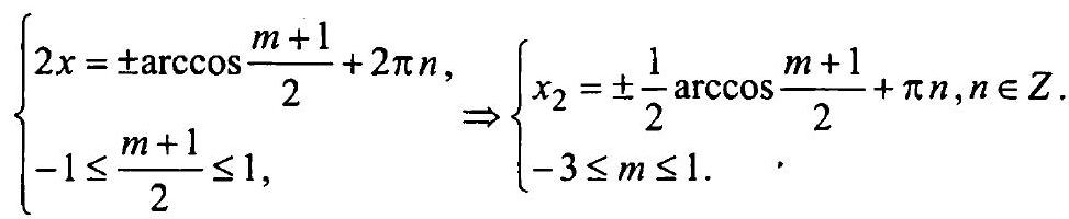 🔑:## Solution.From the formula cos 3 alpha=4 cos ^{3} alpha-3 cos alpha, we have 4 cos ^{3} x-3 cos x-m cos x=0, cos xleft(4 cos ^{2} x-3-mright)=0.## Hence1) cos x=0, x_{1}=frac{pi}{2}+pi k=frac{pi}{2}(2 k+1), k in Z;2) 4 cos ^{2} x-3-m=0 Leftrightarrow 2(1+cos 2 x)=m+3, cos 2 x=frac{m+1}{2},Answer: x_{1}=frac{pi}{2}(2 k+1), where m in R ; x_{2}= pm frac{1}{2} arccos frac{m+1}{2}+pi n, where m in[-3 ; 1] ; k and n in Z.