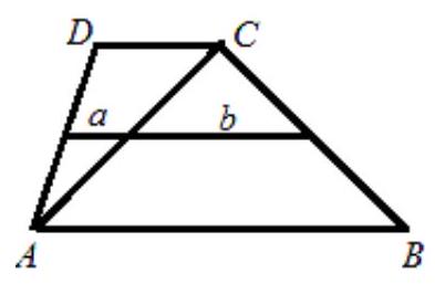 🔑:Solution. Let h be the height of the trapezoid. The segments a and b of the midline of the trapezoid are midlines for triangles triangle A C D and triangle A B C, respectively. Therefore, overline{A B}=2 b and overline{D C}=2 a, hencefrac{P_{triangle A B C}}{P_{triangle A C D}}=frac{frac{overline{A B} cdot h}{2}}{frac{overline{D C} cdot h}{2}}=frac{b}{a}## IX Department
