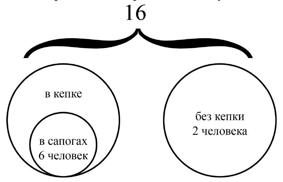 🔑:Answer. Those who were in caps but without boots were 2 more than those who were in boots.Solution. Out of 16 boys, 10 were without boots, which means 6 were in boots. Two were without caps, so 14 were in caps. Since everyone who wore boots also wore a cap, out of the 14 who wore caps, 6 also wore boots, and the remaining 8 did not wear boots. Therefore, those who were in caps and without boots (8 people) are 2 more than those who were in boots (6 people).This reasoning can be conducted based on the diagram:![](https://cdn.mathpix.com/cropped/2024_05_06_843bb5844bda57b2e45dg-2.jpg?height=609&width=945&top_left_y=969&top_left_x=561)## Grading Criteria.- Complete and justified solution - 7 points.- Correct reasoning was conducted, but the final step was not taken (the number of those in caps and without boots and those in boots were given separately), 6 points.- A correct diagram was drawn or correct reasoning was started, but the solution was not completed - 2 points.- Correct answer without explanation (but with verification that everything matches) 2 points.- Only the correct answer - 1 point.