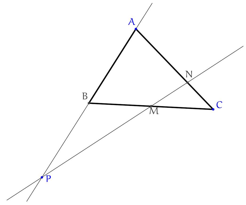 🔑:The relation frac{M B}{M C} cdot frac{N C}{N A} cdot frac{P A}{P B}=1 gives frac{P A}{P B}=2, and P is the symmetric point of A with respect to B.To generalize the concept of "midpoint," "third," I introduced barycenters, which require some practice with vector calculus, and demonstrated Ceva's theorem using barycentric coordinates: let three points on the sides of a triangle, M in (B C), N in (C A), P in (A B); the lines (A M), (B N), (C P) are concurrent if and only if, in algebraic measure, frac{M B}{M C} cdot frac{N C}{N A} cdot frac{P A}{P B}=-1.Then, I recalled the Pythagorean theorem and its generalization, the Law of Cosines: c^{2}=a^{2}+b^{2}-2 a b cos widehat{C}. Along the way, I showed Heron's formula: the area of the triangle S=sqrt{p(p-a)(p-b)(p-c)}.Next, I addressed transformations of the plane: translations, rotations (composition of two rotations), homotheties, similarities, illustrating with two exercises: